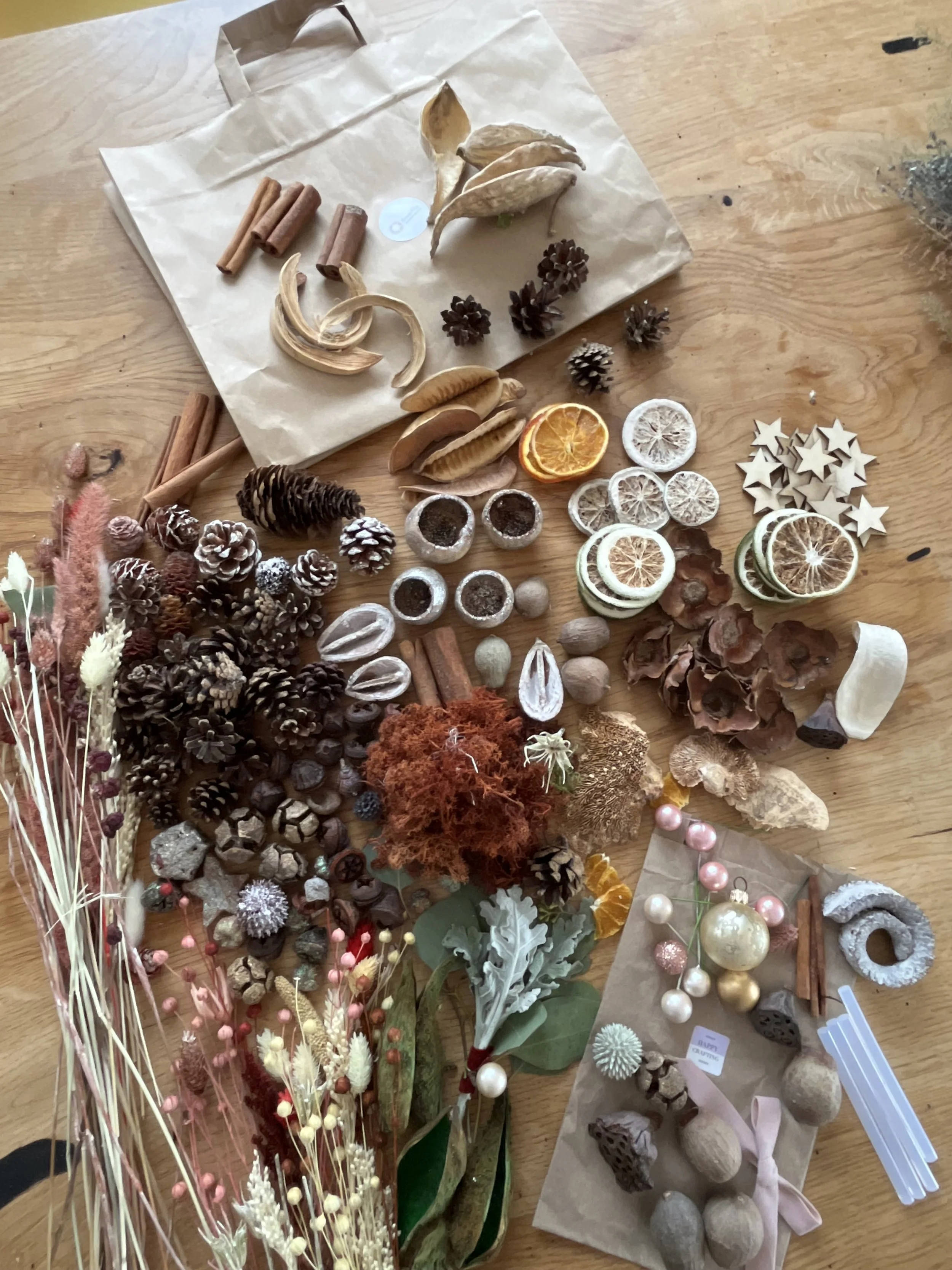 The kit contains a base straw ring, a mix of fir and pine, eucalyptus, a ribbon, classical Christmas decorations like pine cones, stars, orange slices, wire, a bunch of decorative dried plants.