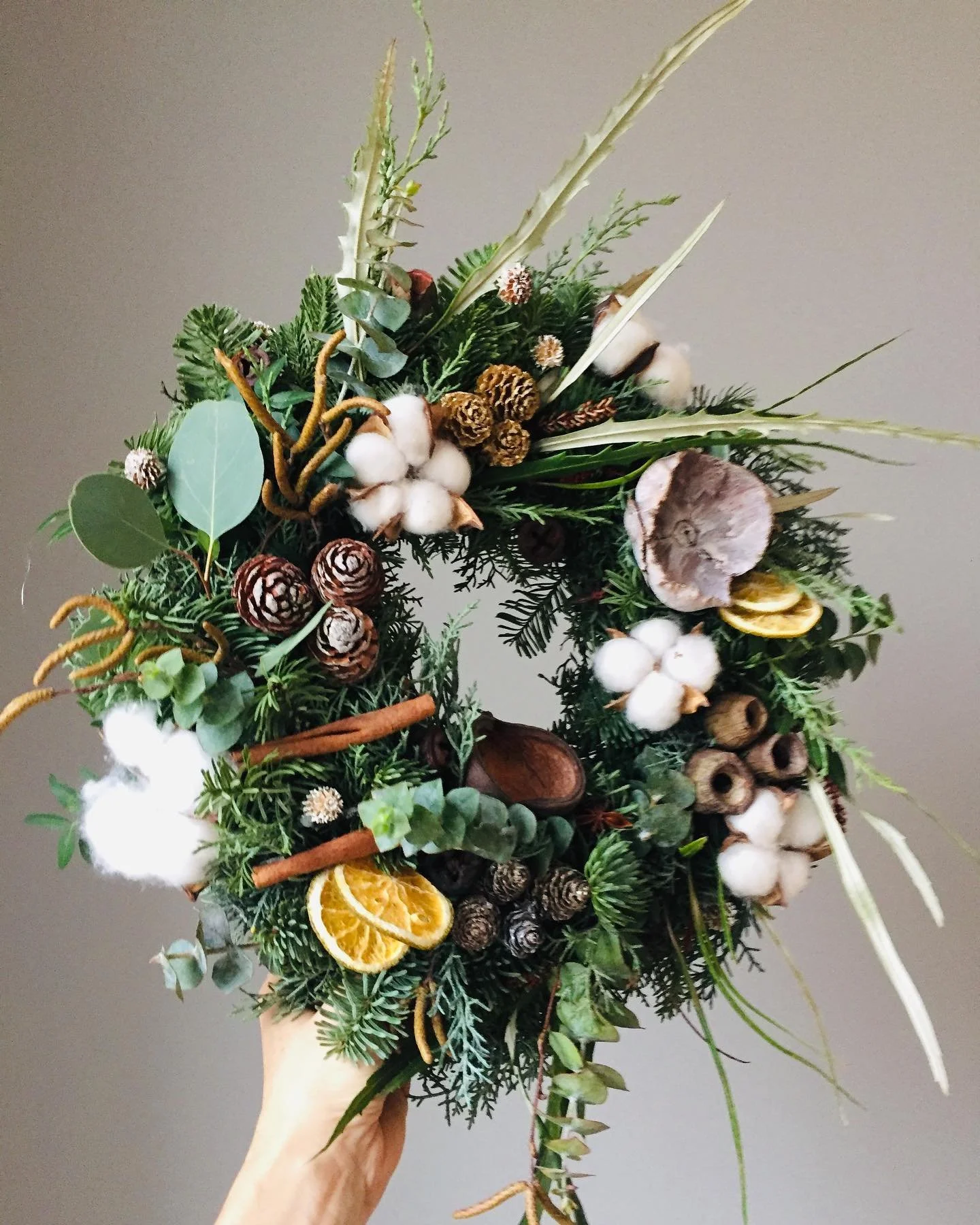 40 to 50 cm wreath made from a mix of evergreens, eucalyptus, cotton, pine cones, dried orange slices, cinnamon sticks, and seasonal decorations.